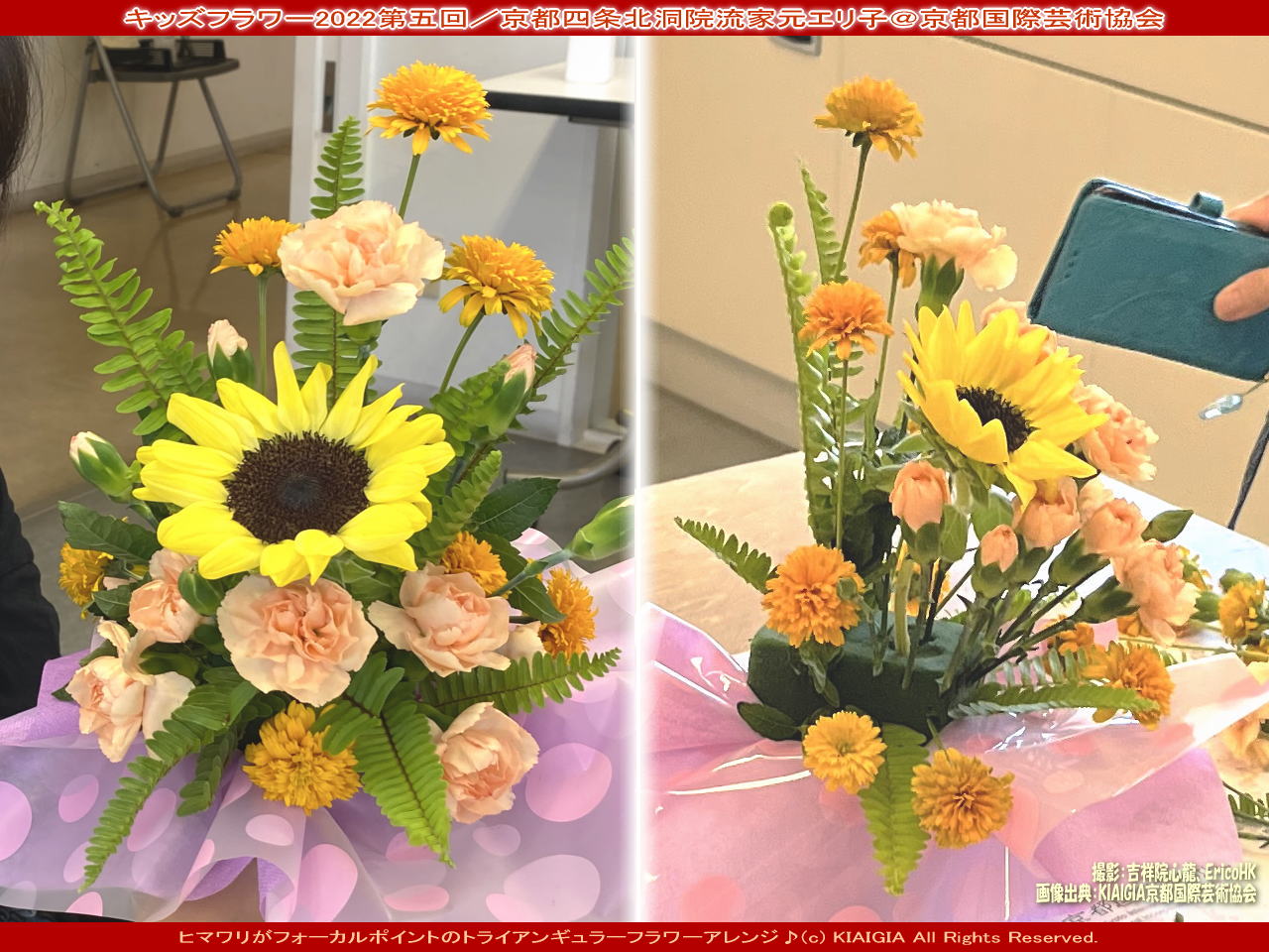 ■タグ=キッズフラワー 花前カレン フラワーアレンジ トライアンギュラー 姫ヒマワリ フォーカルポイント 制作手順4工程 西村園子 家元エリ子 京都国際芸術協会