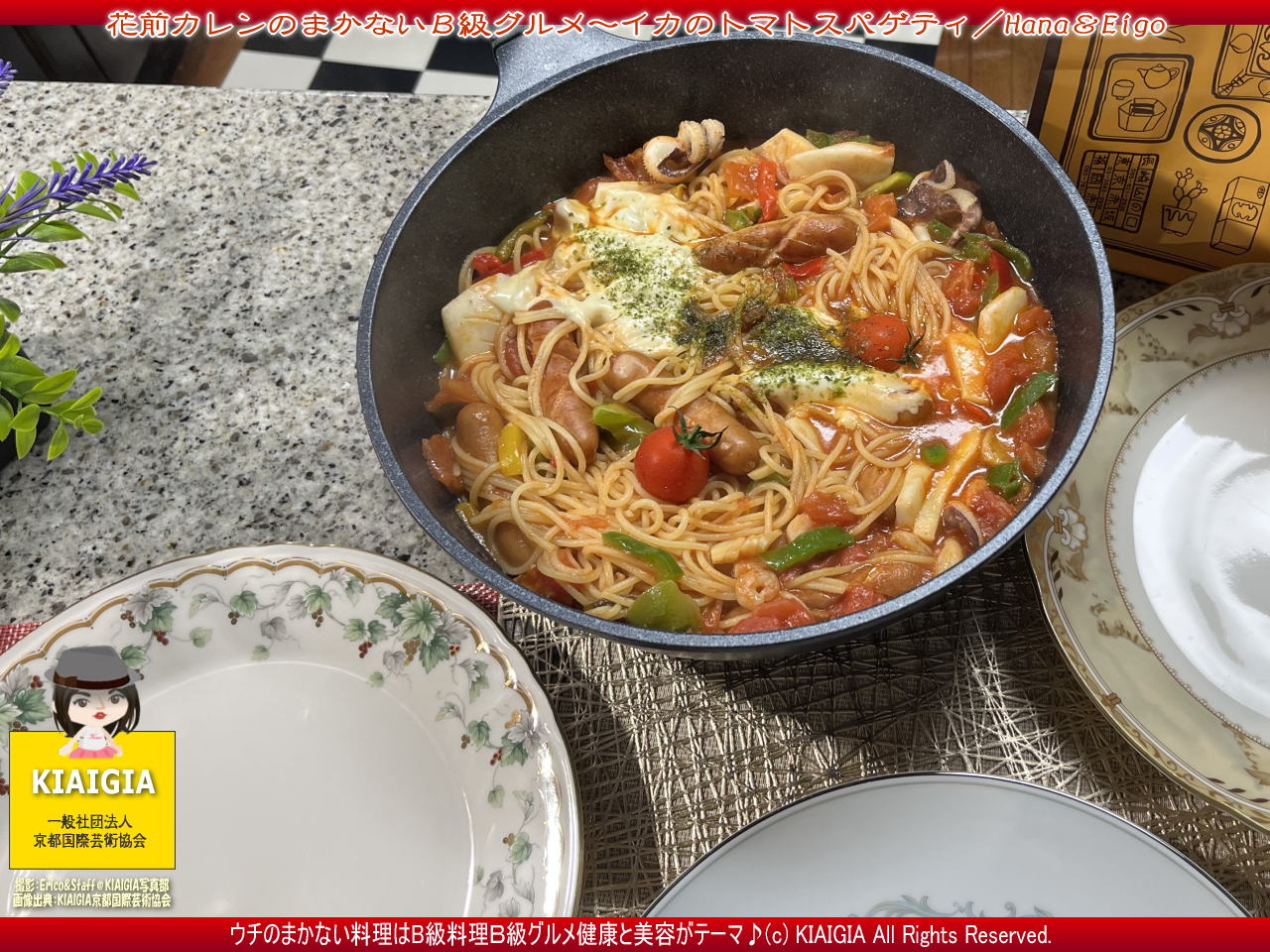 画像タイトルは、ファイルタイトルと違って、「花前カレンのまかないB級グルメ~イカのトマトスパゲティ/Hana&Eigo」で統一しています。