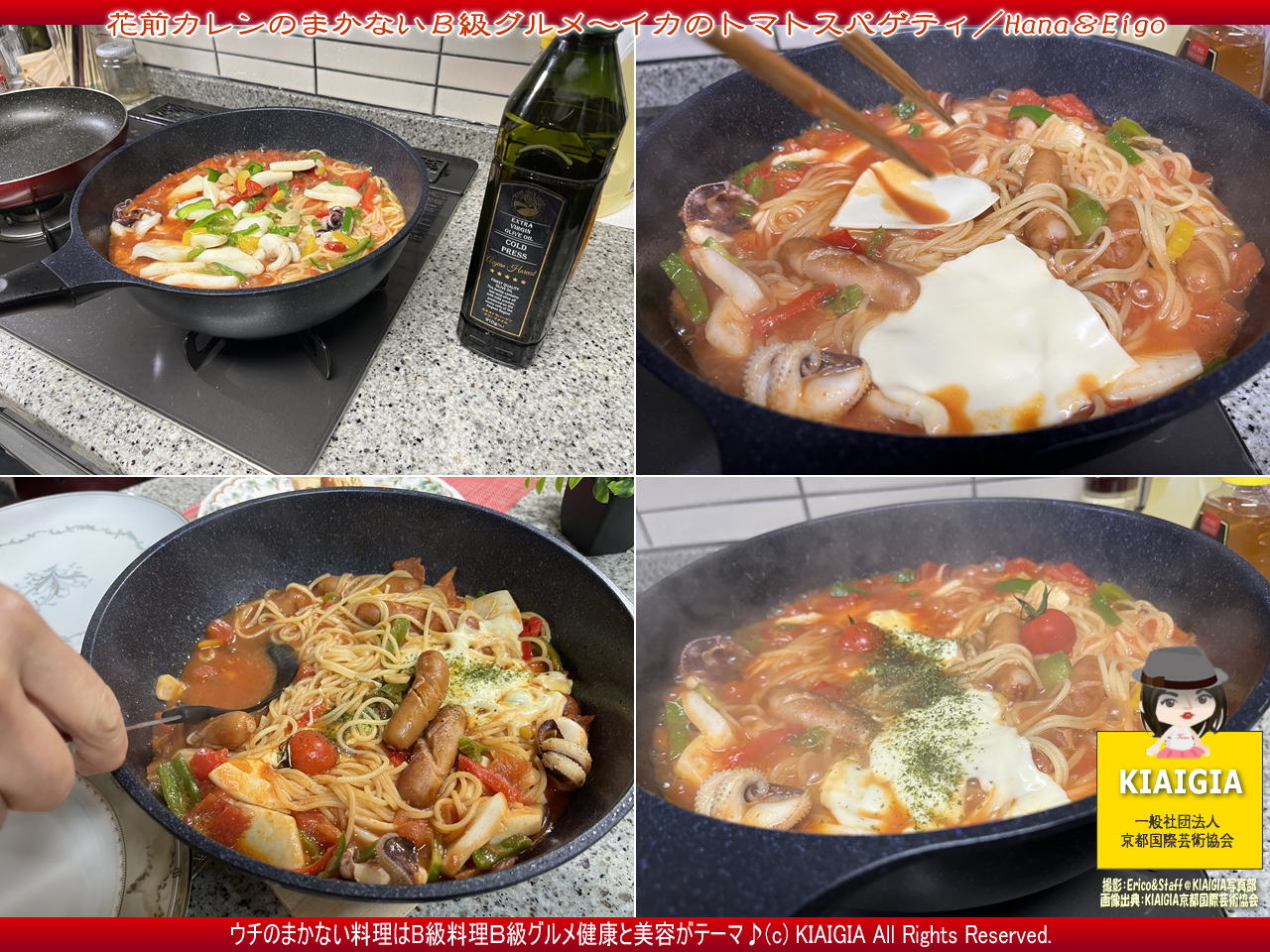 さて、トップのタイトル画像は、ウチの会社のまかない料理Hana&Eigoのイカのトマトスパゲティを調理している一連の4枚編集のワンショットビジュアルです。