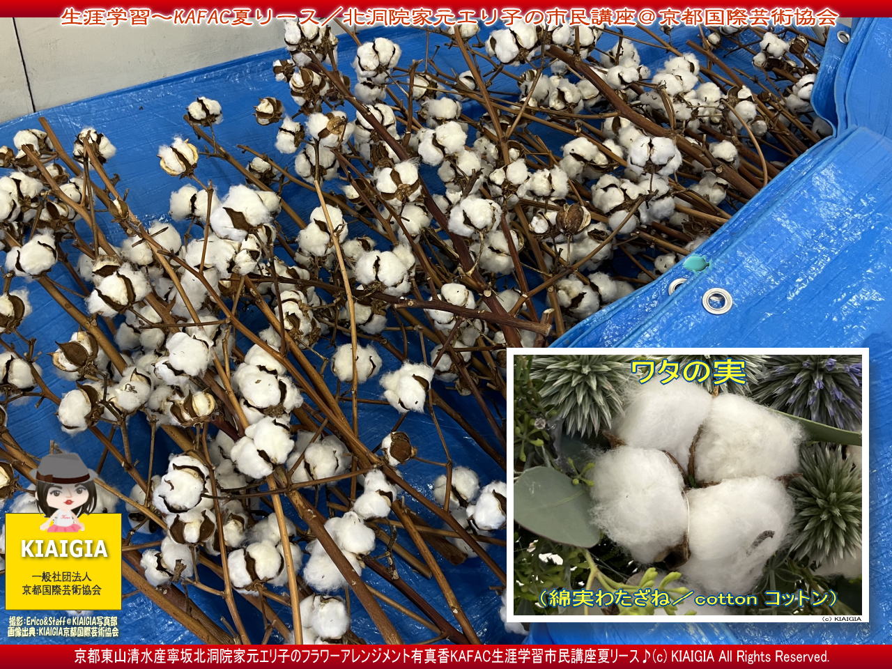 さて、今回7月23日の大阪府岸和田市教育委員会生涯学習葛城地区公民館(有真香会館)クラブ講座「KAFACレッスン家元エリ子の市民講座」は、貴重な時期外れのワタの実(綿の実/綿実わたざね/cotton コットン)を使って意外性を演出しました。