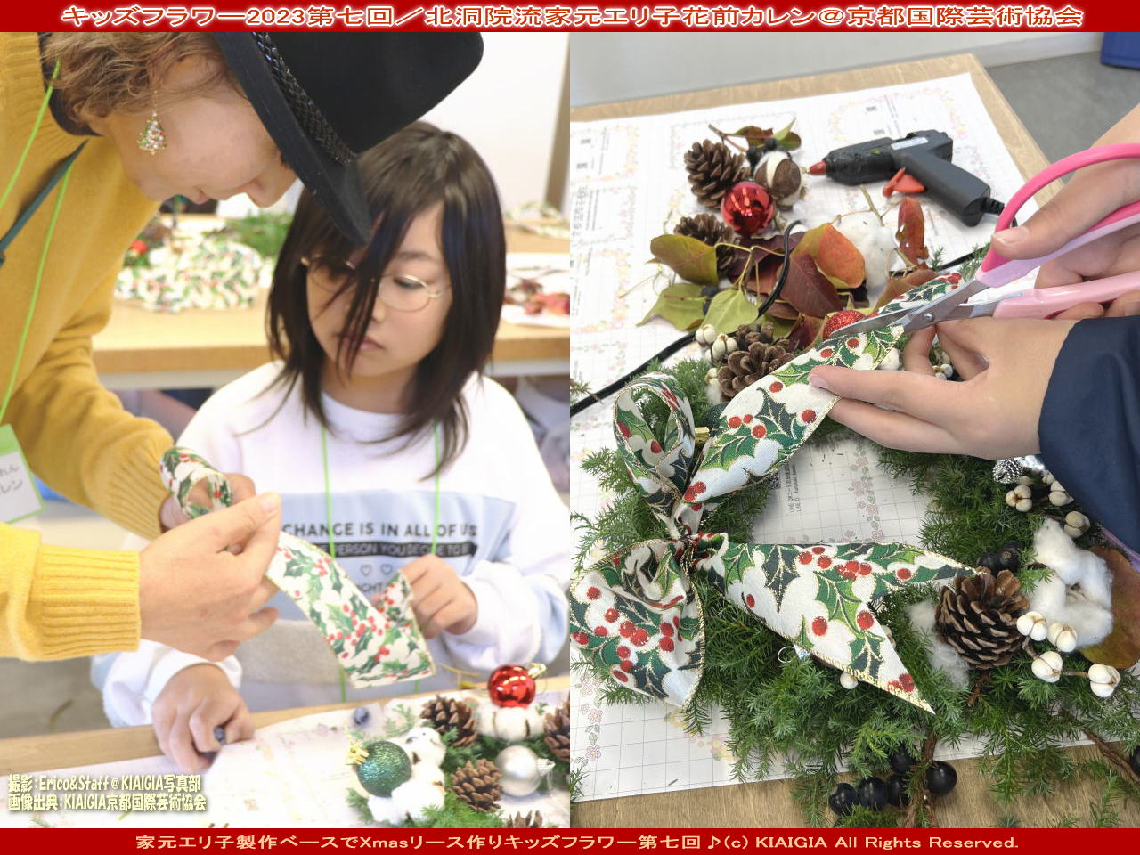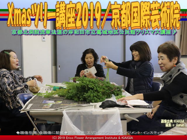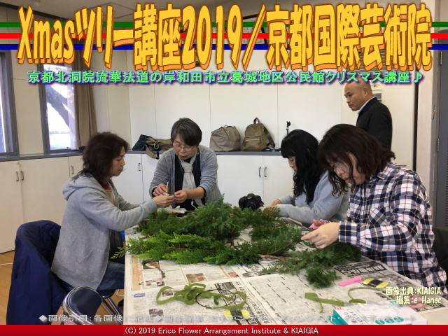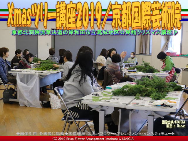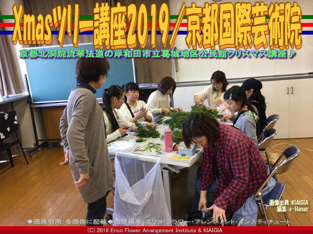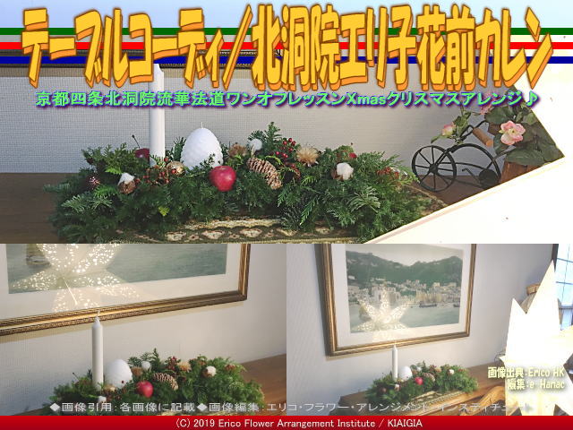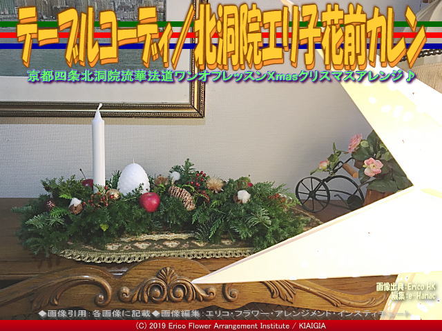 上のタイトル画像は、京都四条北洞院流の非営利型一般社団法人京都国際芸術院(法人番号7130005015305/略称:KIAIGIA/キアイジャ/公式ページ/Facebookページ/公式Twitter/代表のTwitter)のワークショップである北大路WSS(正式名称:京都下鴨北大路ワークショップスタジオ)にて行った『楽しく手作りクリスマス!』講座で、私エリ子花前カレン(公式ブログ、Profile、facebook、Twitter、公式HP1、公式HP2)が<クリスマスアレンジ・テーブルコーディ>をお教えしているビジュアルワンショットです。